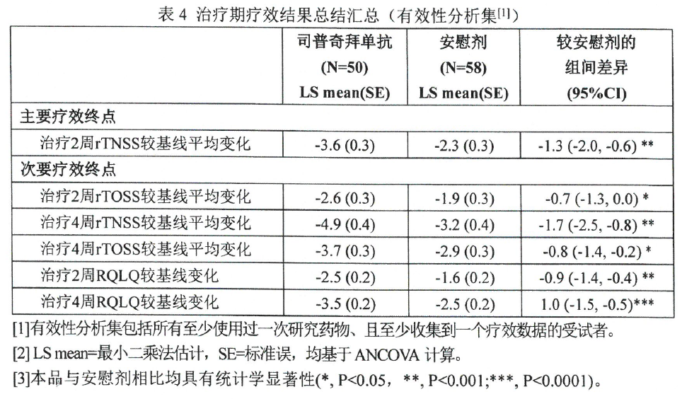 根据该药治疗季节性过敏性鼻炎的Ⅲ期临床研究报告,司普奇拜单抗可以有效控制鼻部的过敏症状,治疗2周、4周rTNSS(回顾性鼻部症状总评分)较基线平均变化显著优于安慰剂。此外,司普奇拜单抗还可以有效控制眼部过敏症状和显著改善生活质量。
