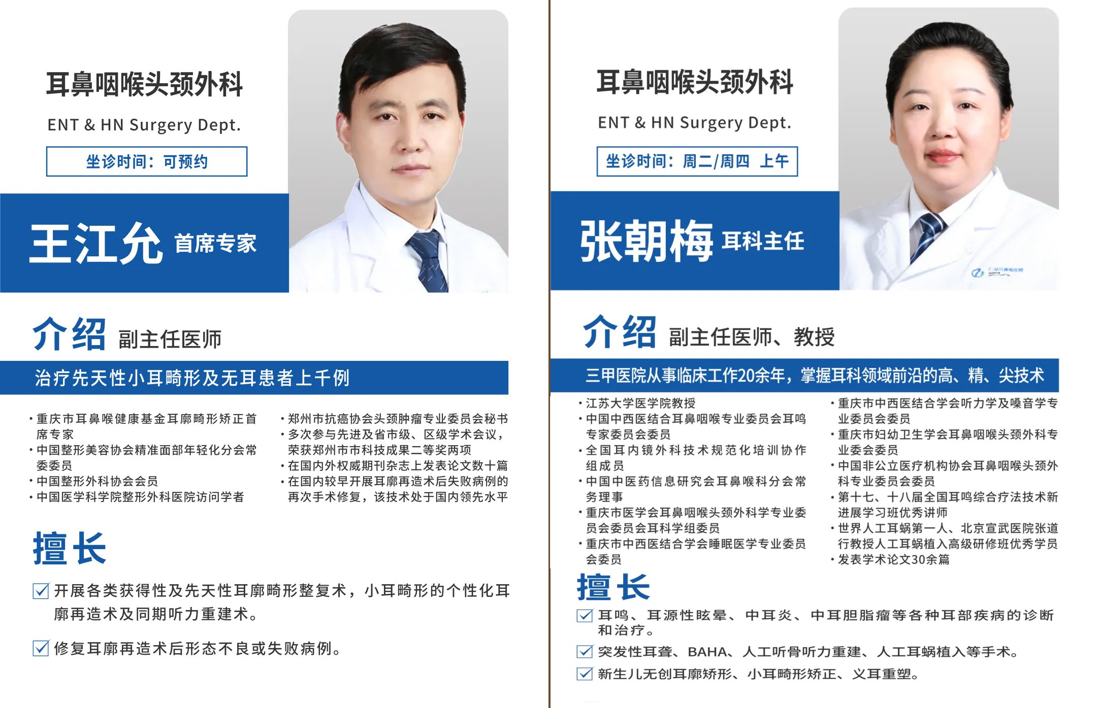 两位专家均具备丰富的小耳畸形诊疗临床经验,擅长根据患者情况制定个性化诊疗方案,从术前评估、手术实施到术后康复全程保驾护航,让患儿获得更安全、更理想的诊疗效果。