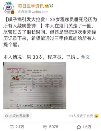 嗓子痛险致命?33岁程序员垂死经历为所有人敲响警钟!