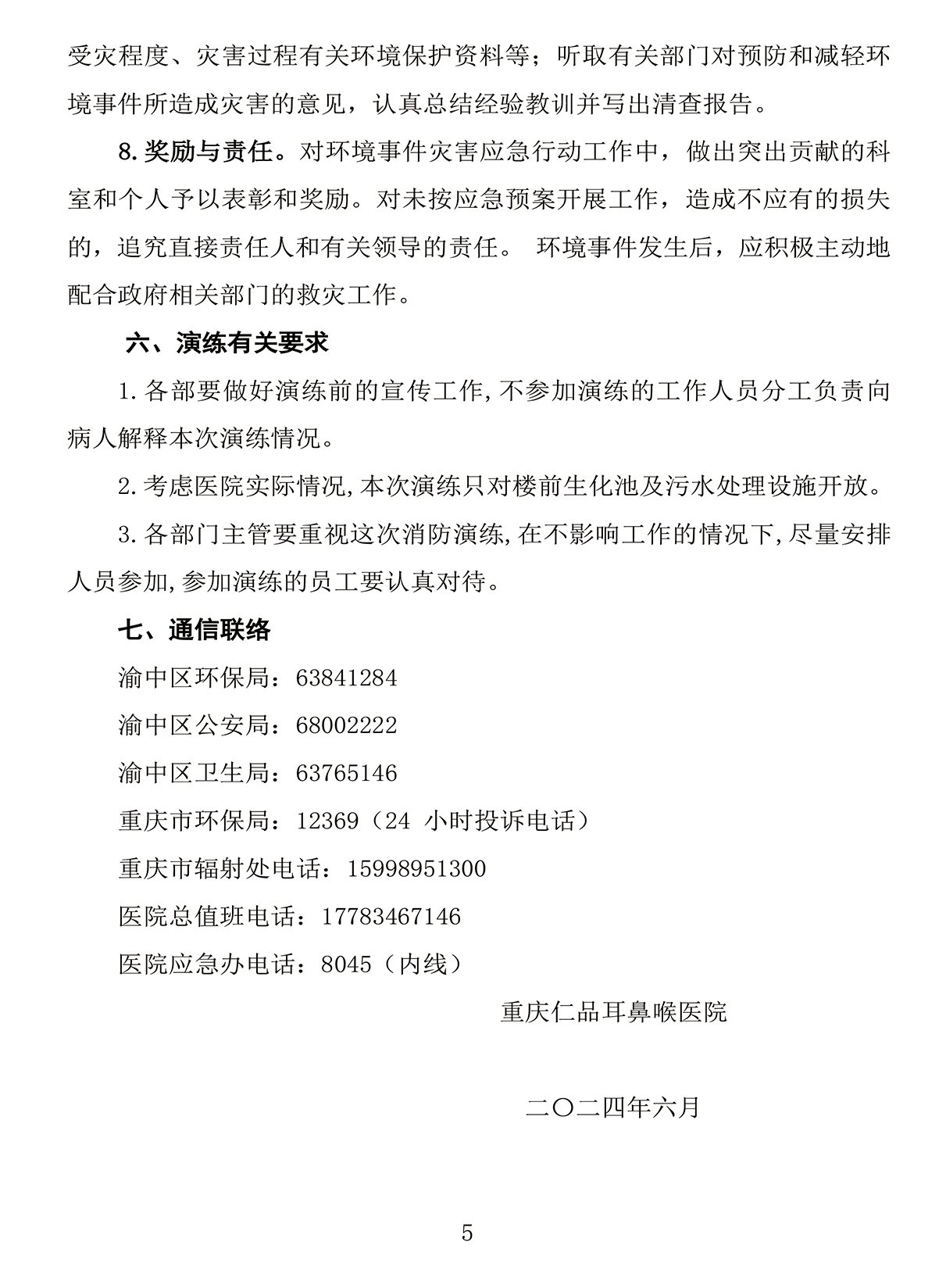 为了有效应对突发性环境事件,积极预防、及时控制、消除隐患,提高应对反应和救援水平,将突发性环境事件对人员、财产和环境造成的损失降低到最小程度,最大限度的保障人民群众的生命财产安全及生态环境安全,维护社会稳定,医院将组织进行- -次突发环境事件应急演练。本预案预设在本院区域范围内人为或不可抗力的废水、废气、固废(包括危险废物)破坏事件,因自然灾害造成的危及人体健康的环境污染事故等。为了使这次演练达到预期的目的,同时又能最大限度地减小对医院正常医疗秩序的影响,特制订本次演练方案,具体行动细则如下: