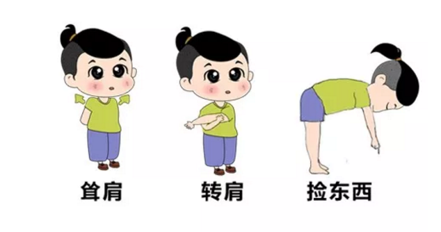 坐位进行上述眼和头的运动练习,然后,耸肩与转肩,弯腰拾物。